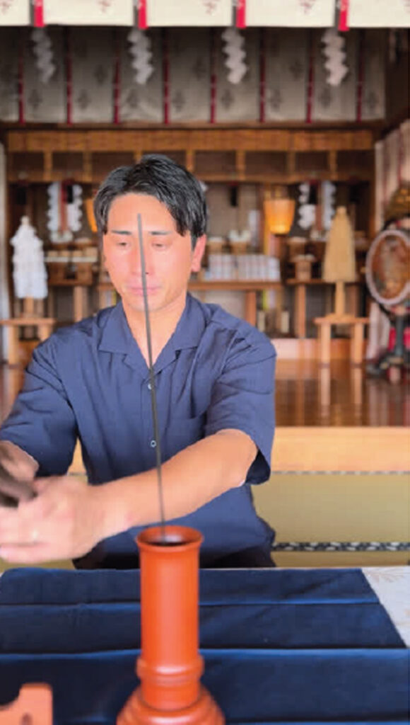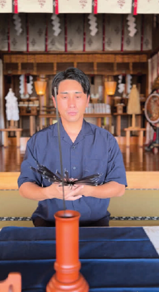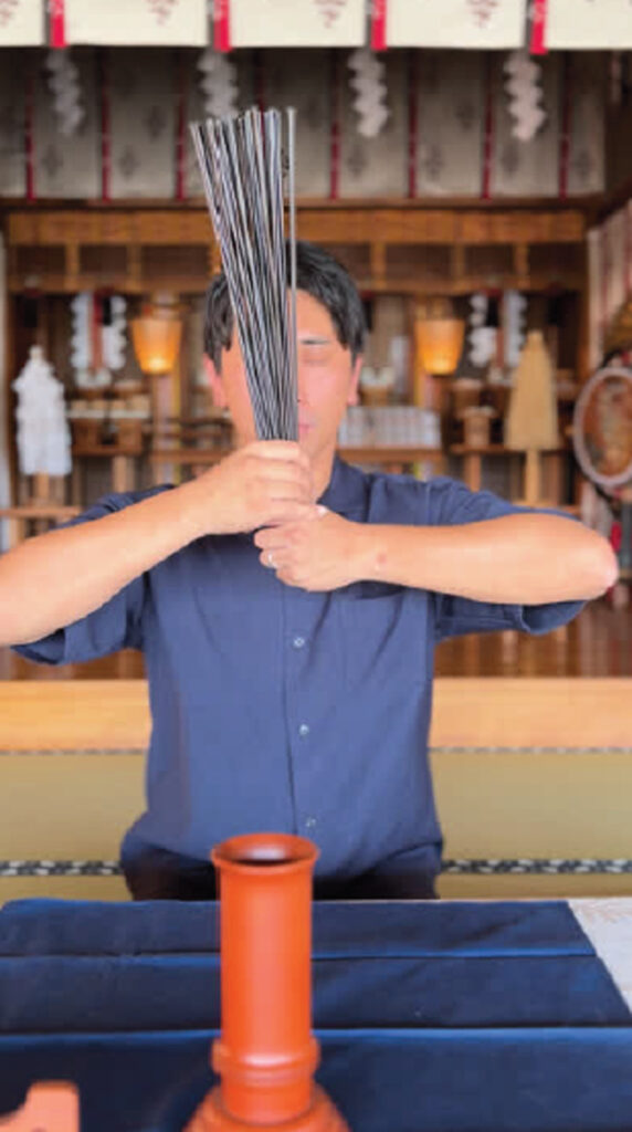 ①まずは、筮竹の操作に入る前に、数回、深呼吸をします。写真の小林宏基さん曰く「深呼吸の際は、体の空気を入れ替えるようなイメージをしています」とのことです。